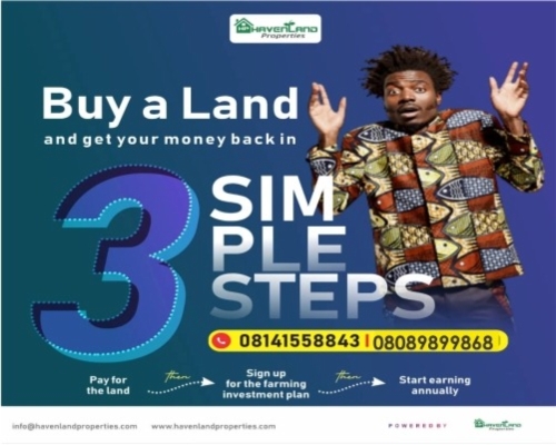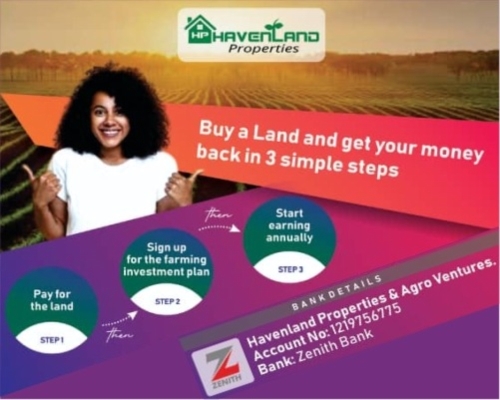 Read MoreYou can now get your money back when you buy land from Havenland Properties & Agro Ventures. All you need to do is subscrible to our Agricultural Plan. We simply use your land for farming and pay you returns annually.